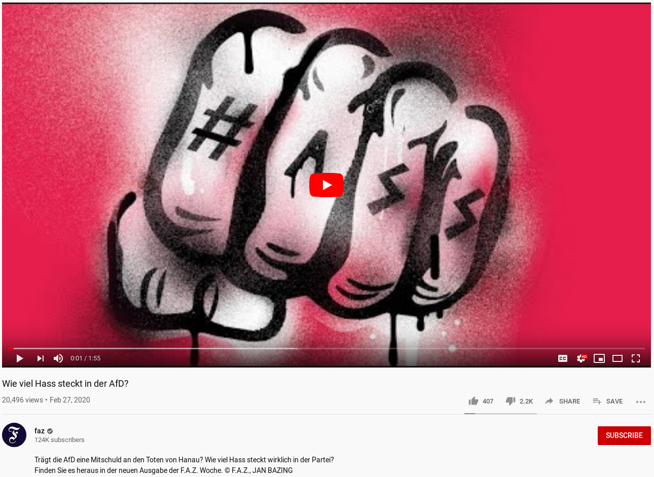 Was bedeutet es, daß bei Youtube 400 Daumen nach oben zeigen und 2,2 Kilodaumen nach unten? (Wenn Sie auf das Bild klicken, sehen Sie auch die kleine Schrift.) Heißt das, 15% schließen sich der Behauptung des Videos und dem, was vermutlich in der FAZ Woche steht, an, aber 85% finden das, was sie da sehen, ebenso widerwärtig wie wir? Das gibt Hoffnung, dann sollten sich aber mehr als 2600 Leute zu diesem Unrat eine Meinung bilden. Ein Grund, dies hier zu schreiben.