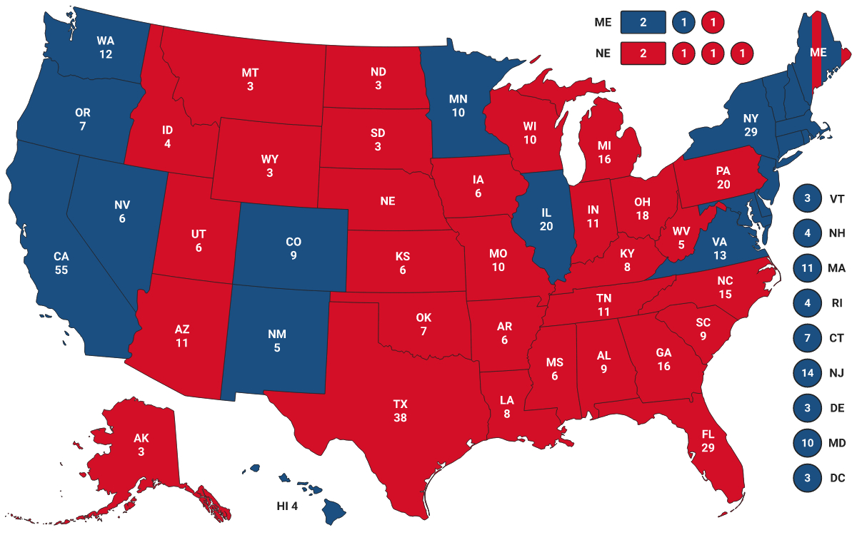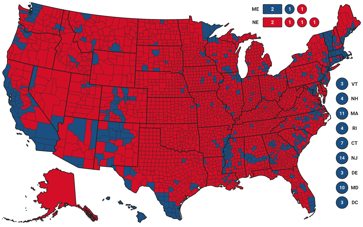 Wir illustrieren das mit der Auswertung der Ergebnisse der Wahl 2016 in Amerika, die nichts mit Sußebach zu tun hat. So wird jedenfalls der Deutsche meinen, der hier in urbanen Siedlungsgebieten lebt, die mit den blauen auf der Karte korrespondieren. Jenen, die draußen in Flyover-Country leben, kann das Wissen, inmitten eines Hortes des Konservativen zu sein, hingegen Beruhigung, das Gefühl der Sicherheit, Frieden bescheren.