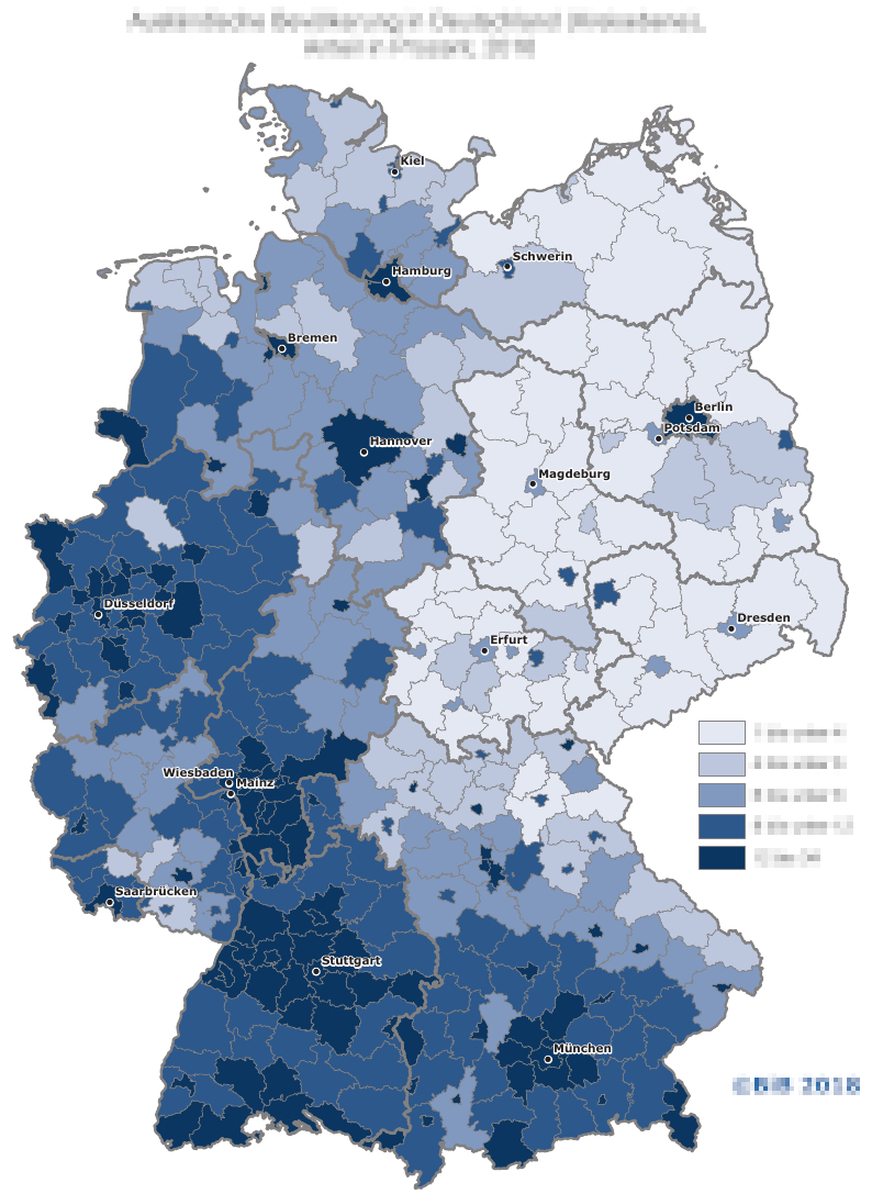 Kommen wir zurück auf Deutschland und schauen wir, wo bei uns Flyover-Country ist, wo es sich leben läßt. Wir überlassen dem Leser zu spekulieren, welches Kriterium für die Messung der Urbanität wir hier gewählt haben.