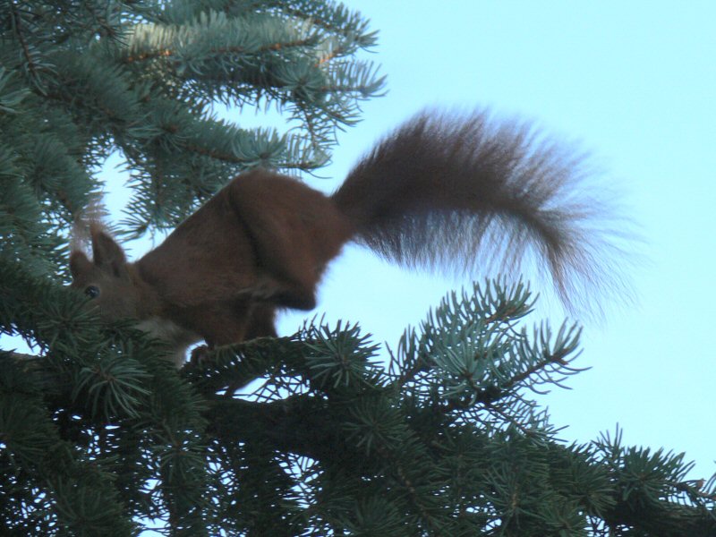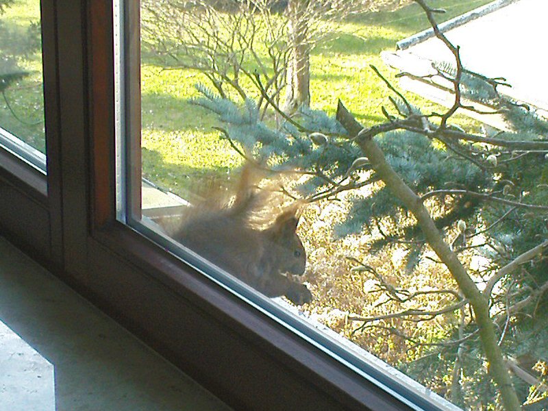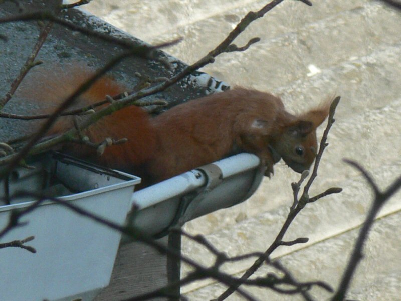 Auf dem Fensterbrett vom Arbeitszimmer im Obergeschoß legen wir seit einiger Zeit Walnüsse aus eigener Ernte aus. Ein Eichhörnchen kommt regelmäßig über Fichte und Magnolienbaum vorbei, manchmal auch direkt die Fassade hoch, und bedient sich. Etwas weiter oben in der Fichte hat es sich schon ein Nest oder Walnußlager angelegt.