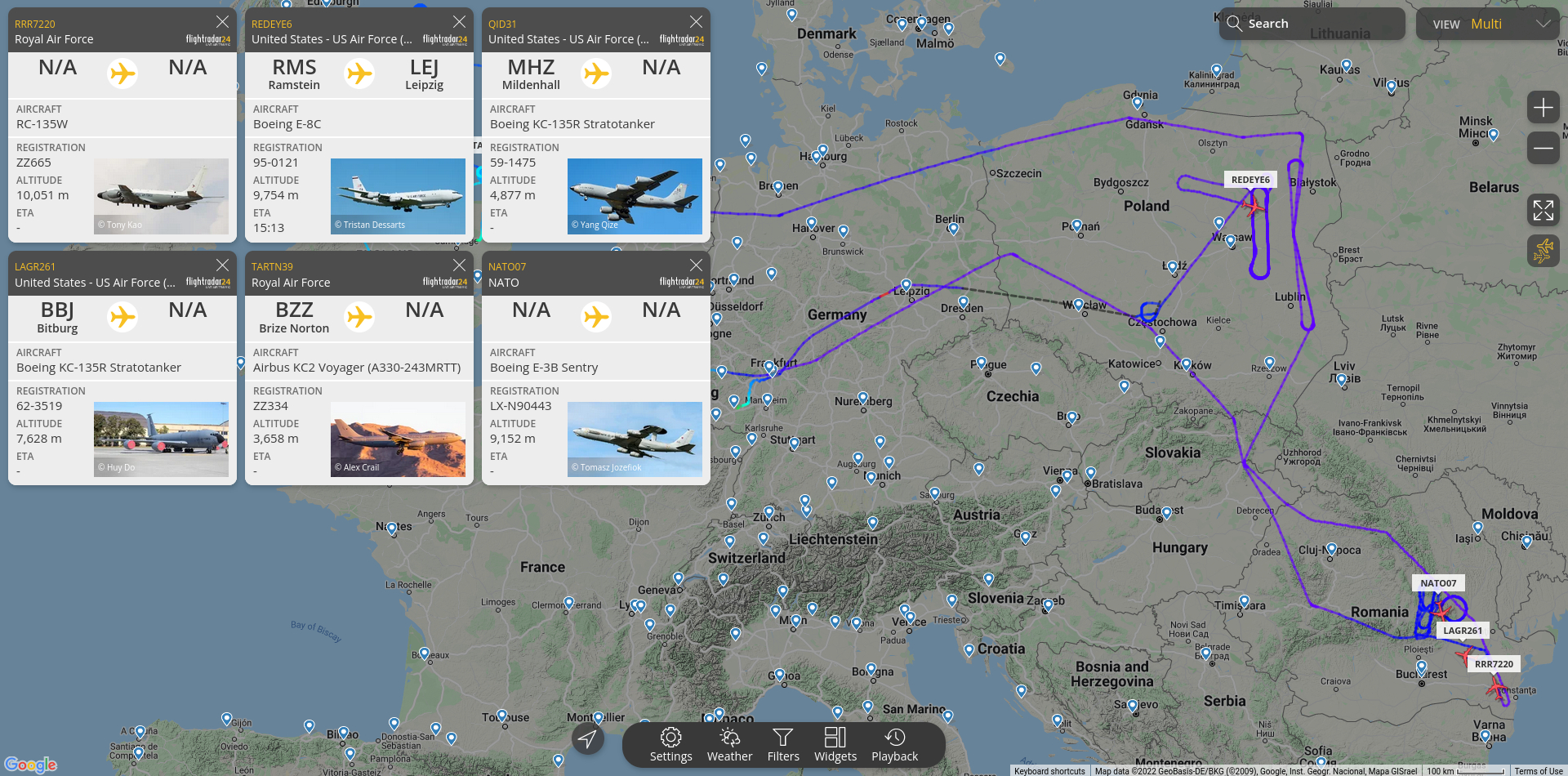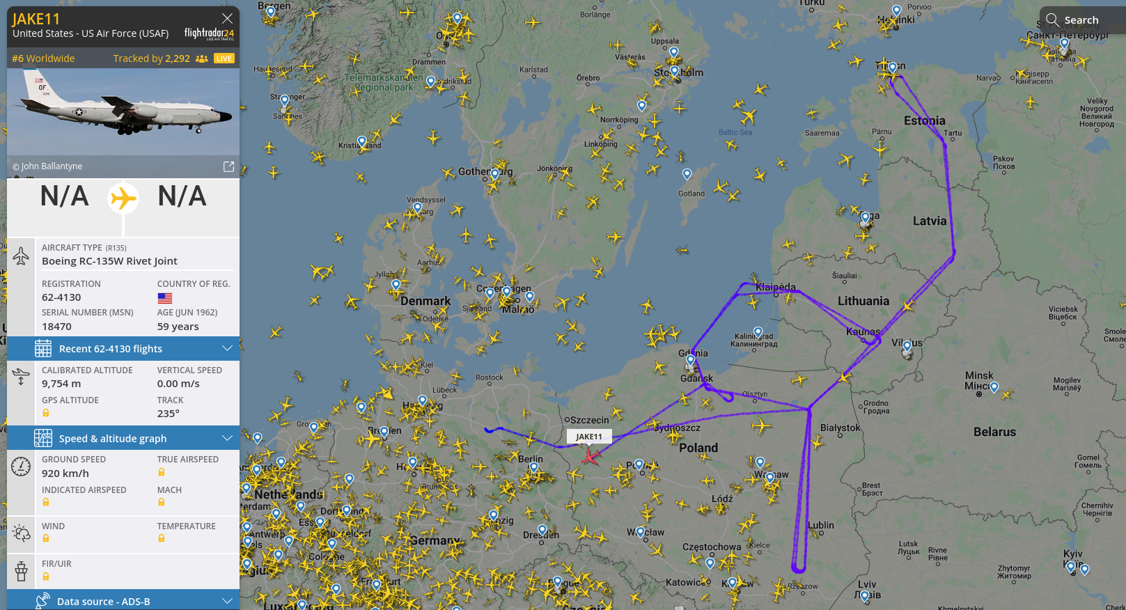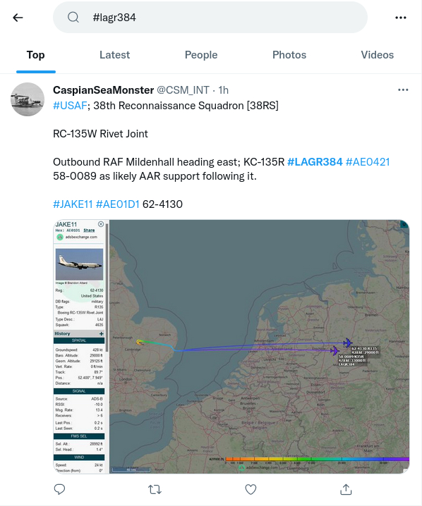 Einziger Anlaß für diese Mission war offenbar "JAKE", ein Aufklärungsflieger, der schon länger unterwegs gewesen sein muß, aber anscheinend vor dem Tanken ohne eine Kennung zu übertragen, denn eine Route vor dem Tankzeitpunkt wird nicht gezeigt. Nach dem Tanken flog er die russisch-weißrussisch-ukrainische Grenze ab und umrundete zweimal die Region Königsberg, um sich dann zum Feierabend auf den Heimweg in die Pfalz zu machen.