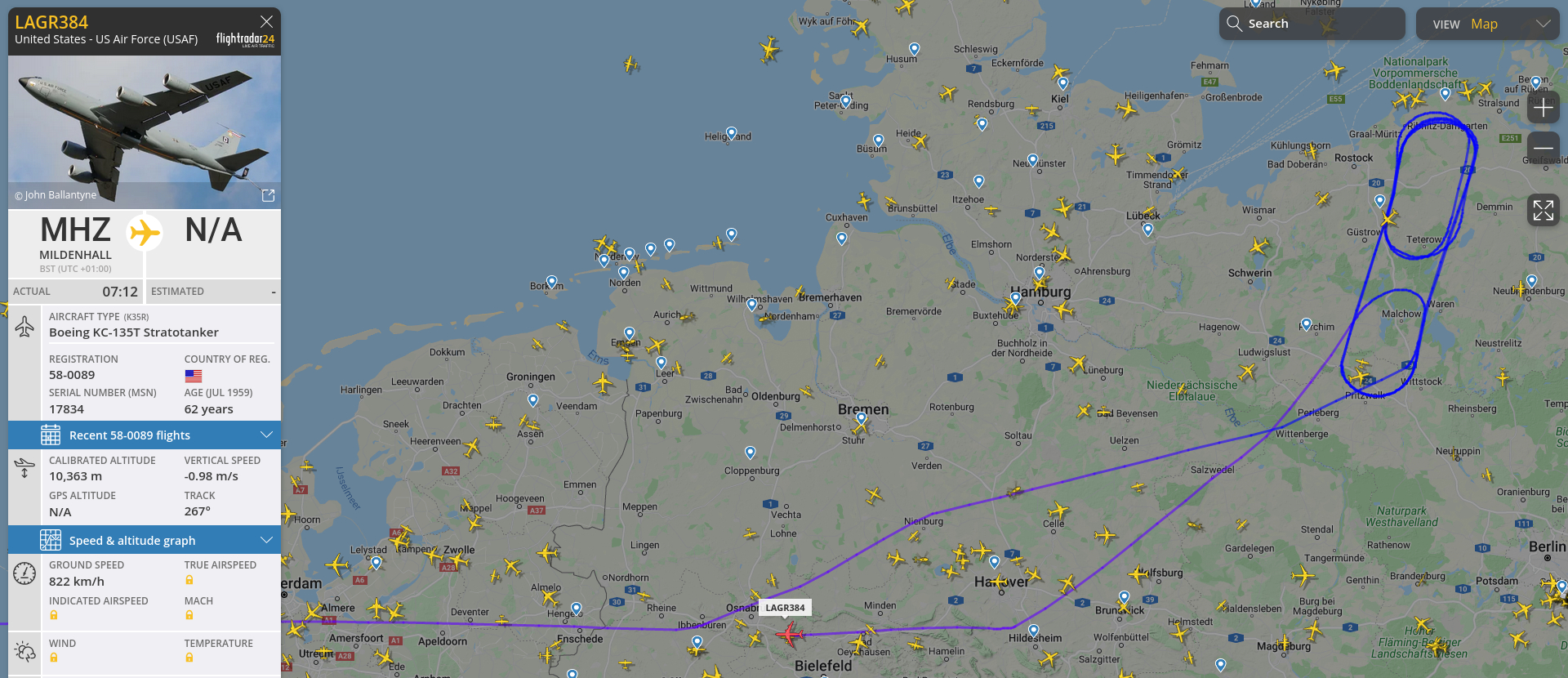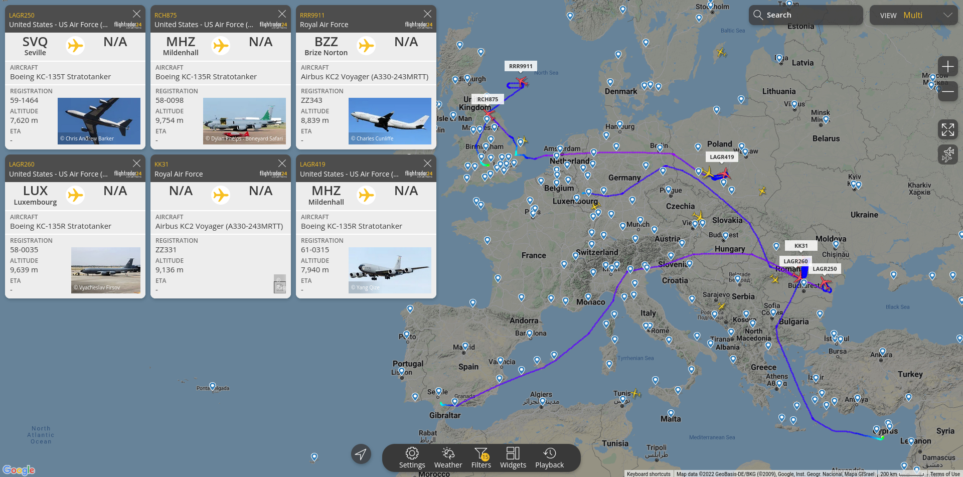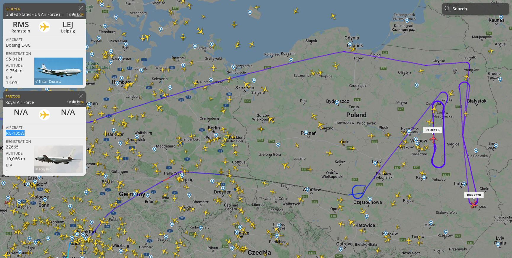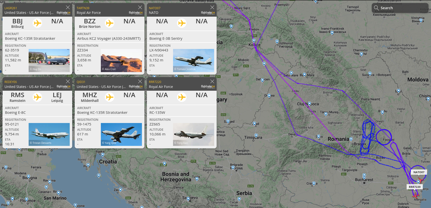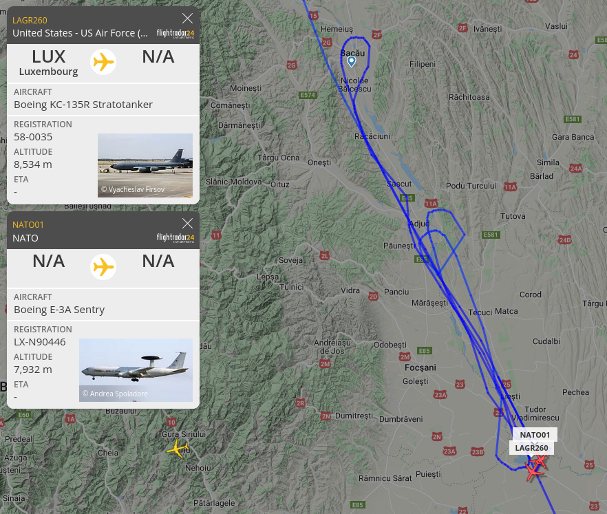 Der Amerikaner verlegte seine Schleife dann nach Blickrichtung Königsberg, während der Engländer weiter nach Rumänien flog, wo auch schon ein Tankflugzeug sowie ein AWACS-Luftaufklärer der Amerikaner kreisten.