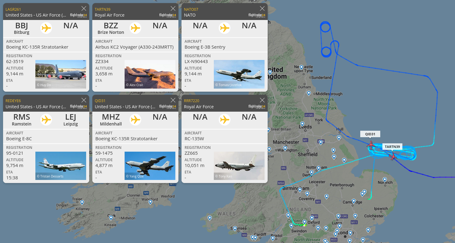 Das war am ersten Tag von Phase 2 der Operation Z, und der NATO-Himmel über unseren Köpfen war voller Gerät. Und so sieht zur Zeit die typische Observierungskonfiguration eines Tages aus: