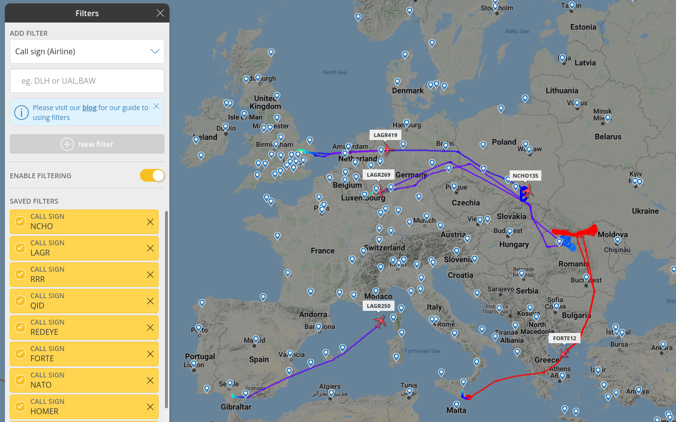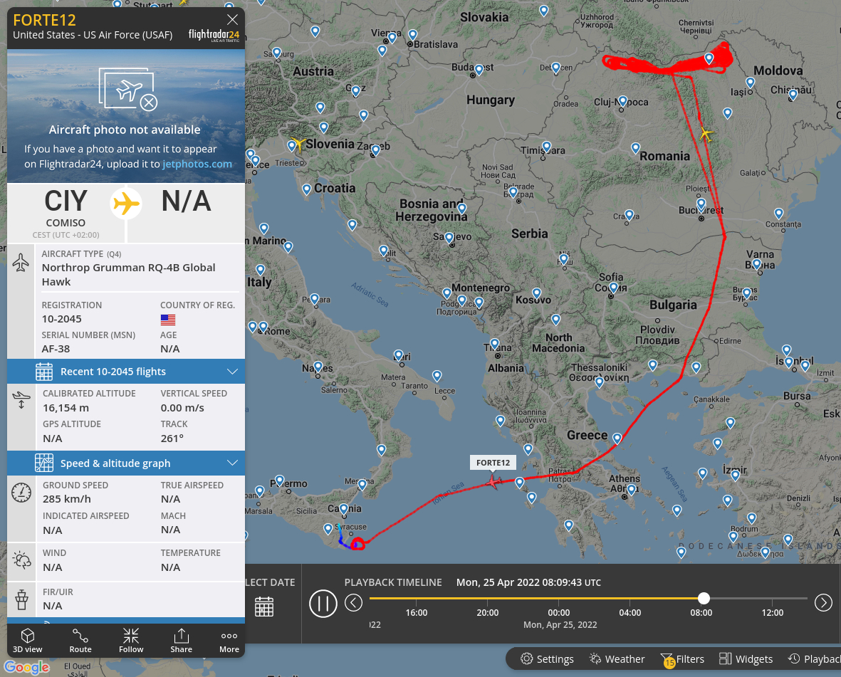 3. Dazu kommt an manchen Tagen eine Langstreckenaufklärungsdrohne, die 24 Stunden am Stück unterwegs ist und unermüdlich grenznahe Bereiche oder das Schwarze Meer abfliegt. Im Bild als "FORTE" zu sehen auf dem Heimflug.