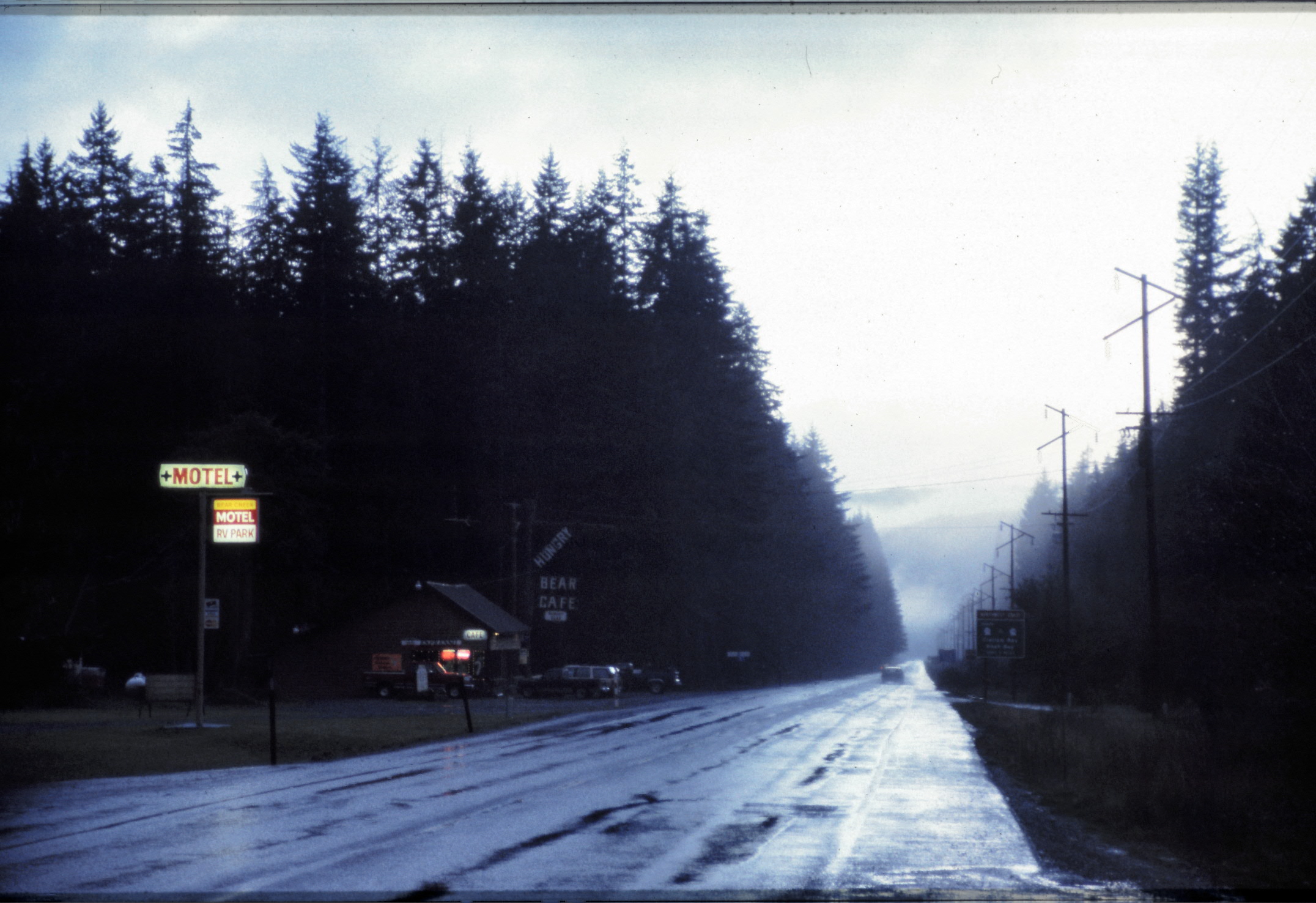 Bei einbrechender Nacht entlang am Lake Crescent durch den Wald, wo es ständig zu regnen scheint. Übernachtung im Bear Creek Motel, vorher ein Abendessen im Hungry Bear Cafe. Holzdielen, Music Box mit damals noch echten Schallplatten, ein bärtiger Naturbursche tanzt mit einem Mädchen, zurechtgemacht wie Laura Dern in Wild at Heart. Alles viel zu sehr Klischee um wahr zu sein.